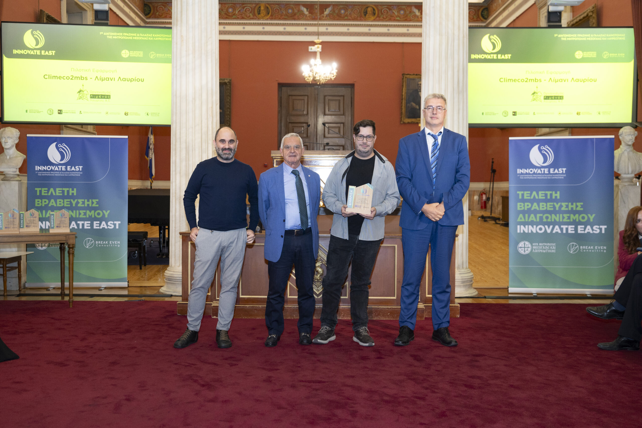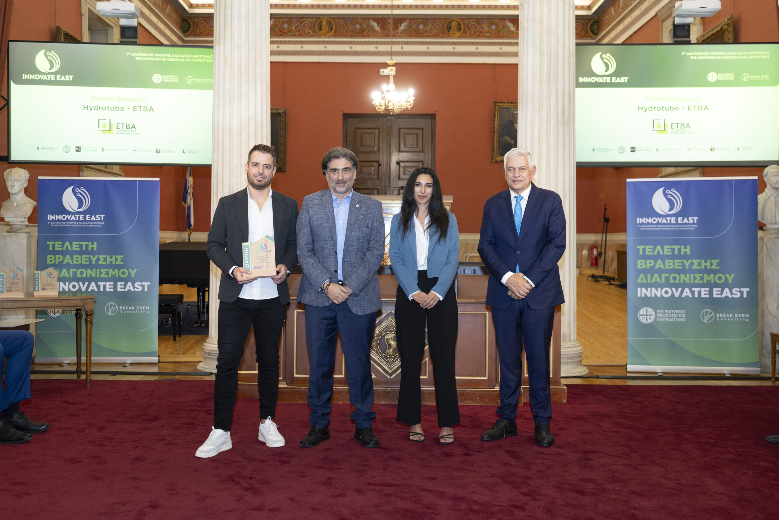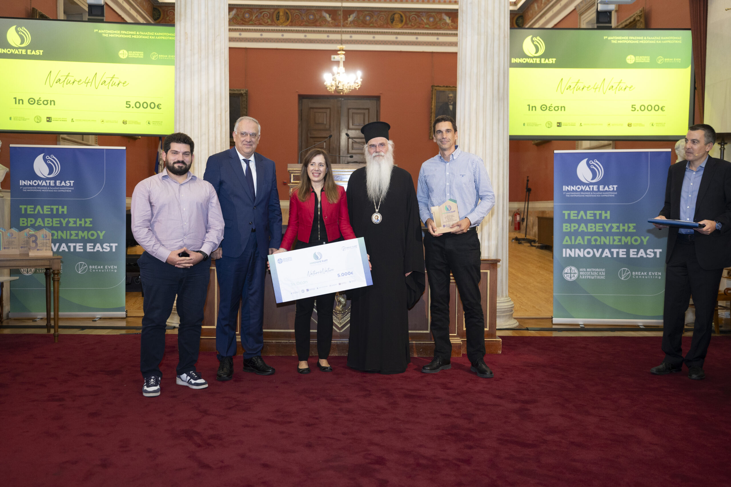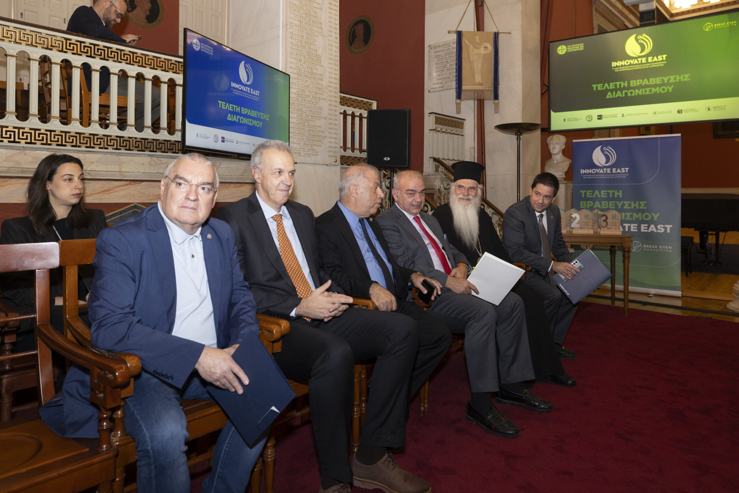 Στην εμβληματική Μεγάλη Αίθουσα Τελετών του Εθνικού και Καποδιστριακού Πανεπιστημίου Αθηνών, παρουσία Υπουργών, Πρυτανικών Αρχών κορυφαίων Πανεπιστημίων της χώρας, εκπροσώπων της Τοπικής Αυτοδιοίκησης, καθώς και επιφανών στελεχών της επιχειρηματικής κοινότητας, ολοκληρώθηκε με πολύ μεγάλη επιτυχία ο 1ος Διαγωνισμός Πράσινης και Γαλάζιας Καινοτομίας της Μητρόπολης Μεσογαίας και Λαυρεωτικής, Innovate East