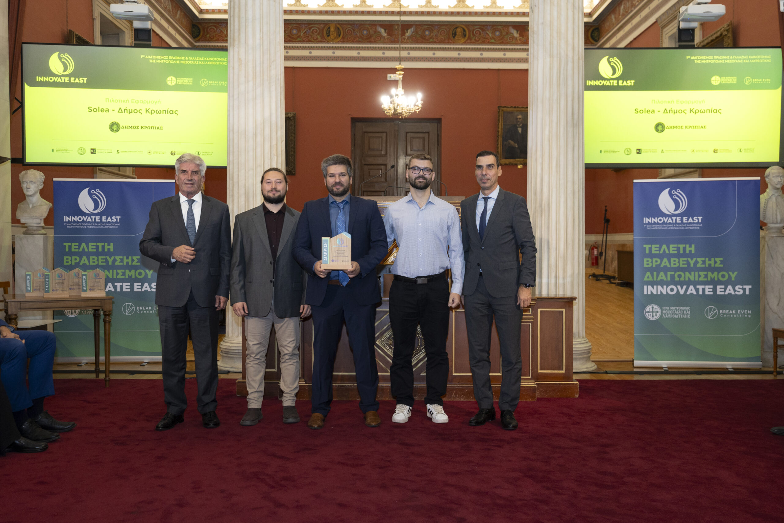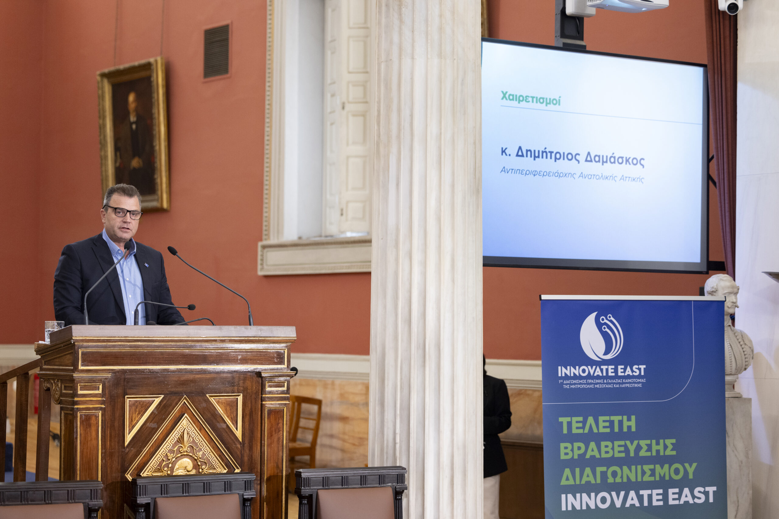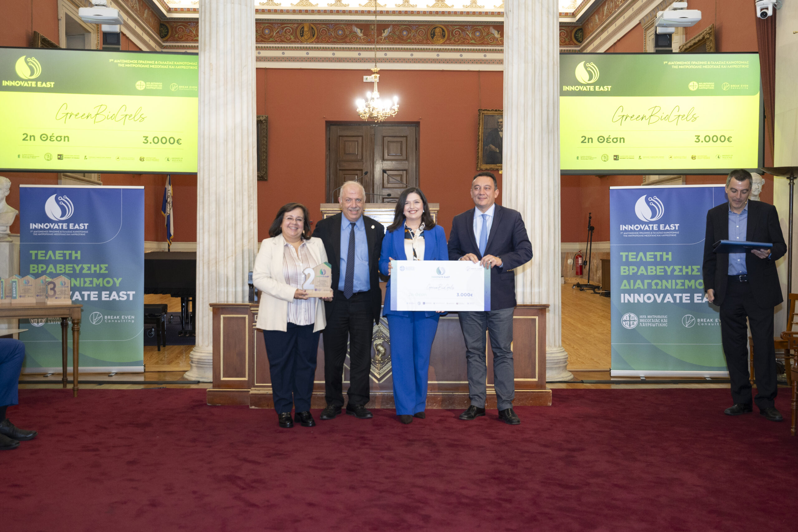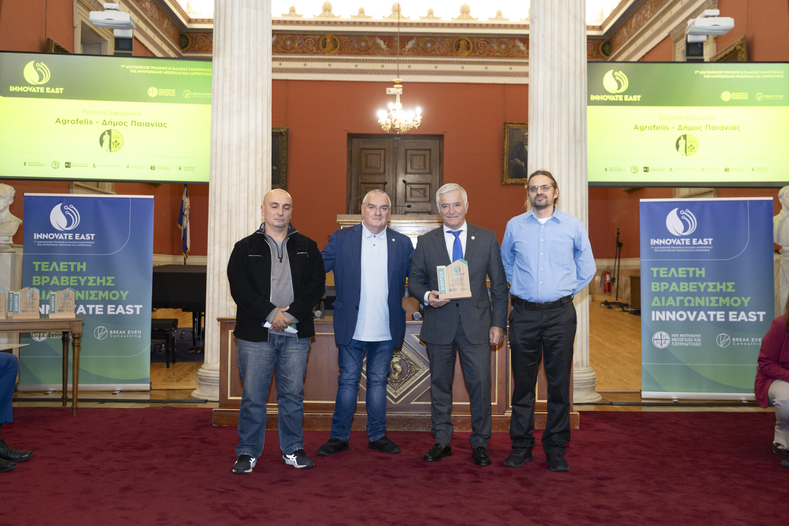 Στην εμβληματική Μεγάλη Αίθουσα Τελετών του Εθνικού και Καποδιστριακού Πανεπιστημίου Αθηνών, παρουσία Υπουργών, Πρυτανικών Αρχών κορυφαίων Πανεπιστημίων της χώρας, εκπροσώπων της Τοπικής Αυτοδιοίκησης, καθώς και επιφανών στελεχών της επιχειρηματικής κοινότητας, ολοκληρώθηκε με πολύ μεγάλη επιτυχία ο 1ος Διαγωνισμός Πράσινης και Γαλάζιας Καινοτομίας της Μητρόπολης Μεσογαίας και Λαυρεωτικής, Innovate East