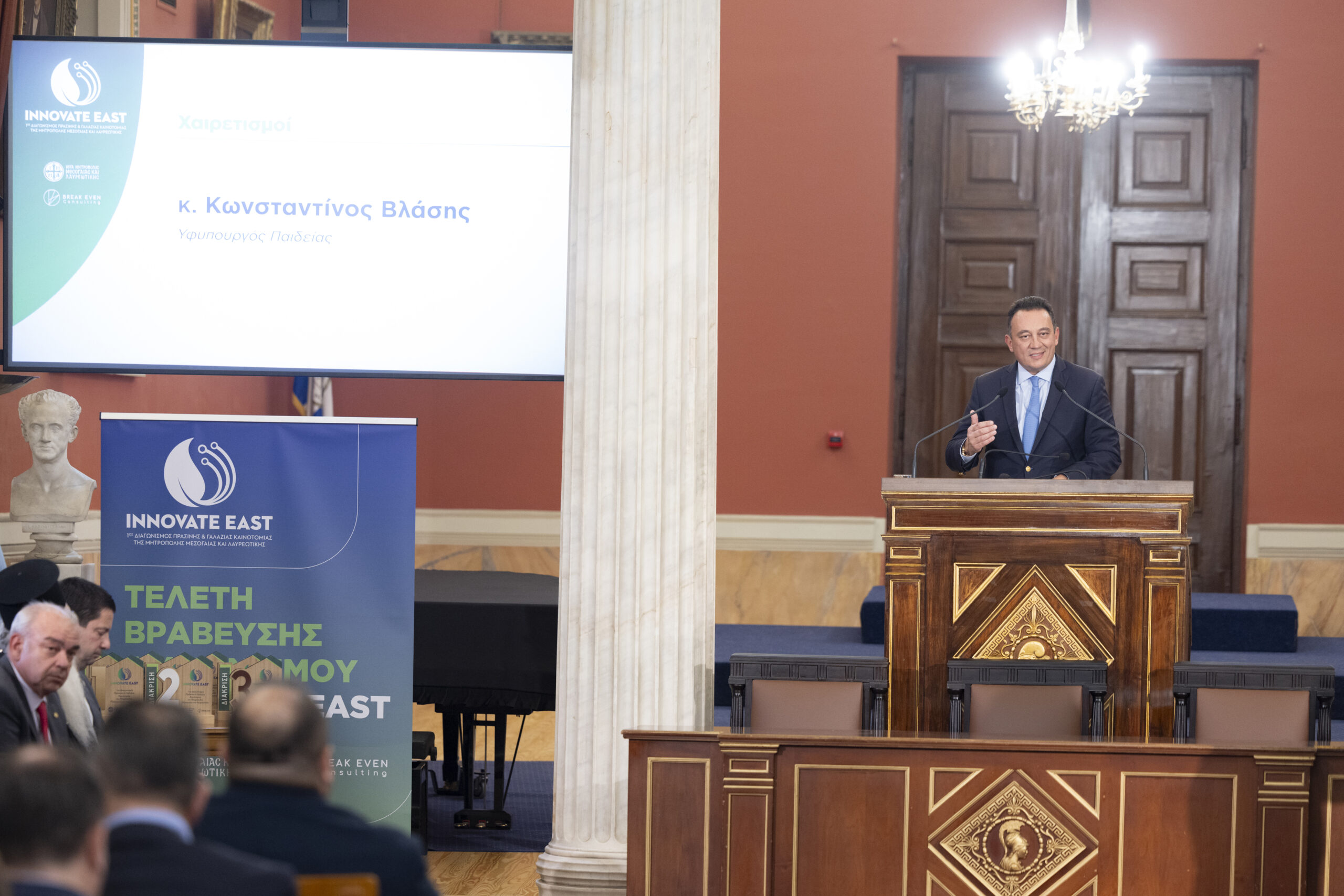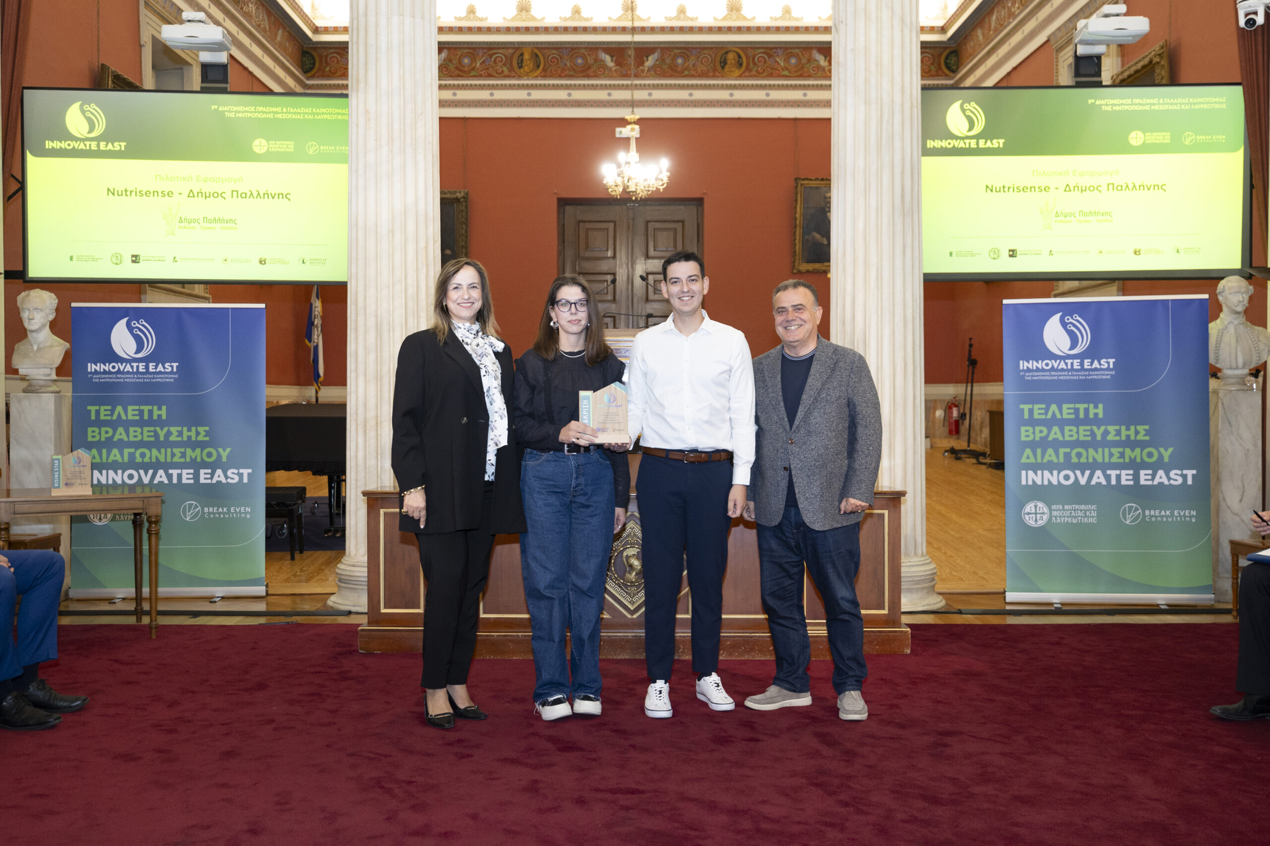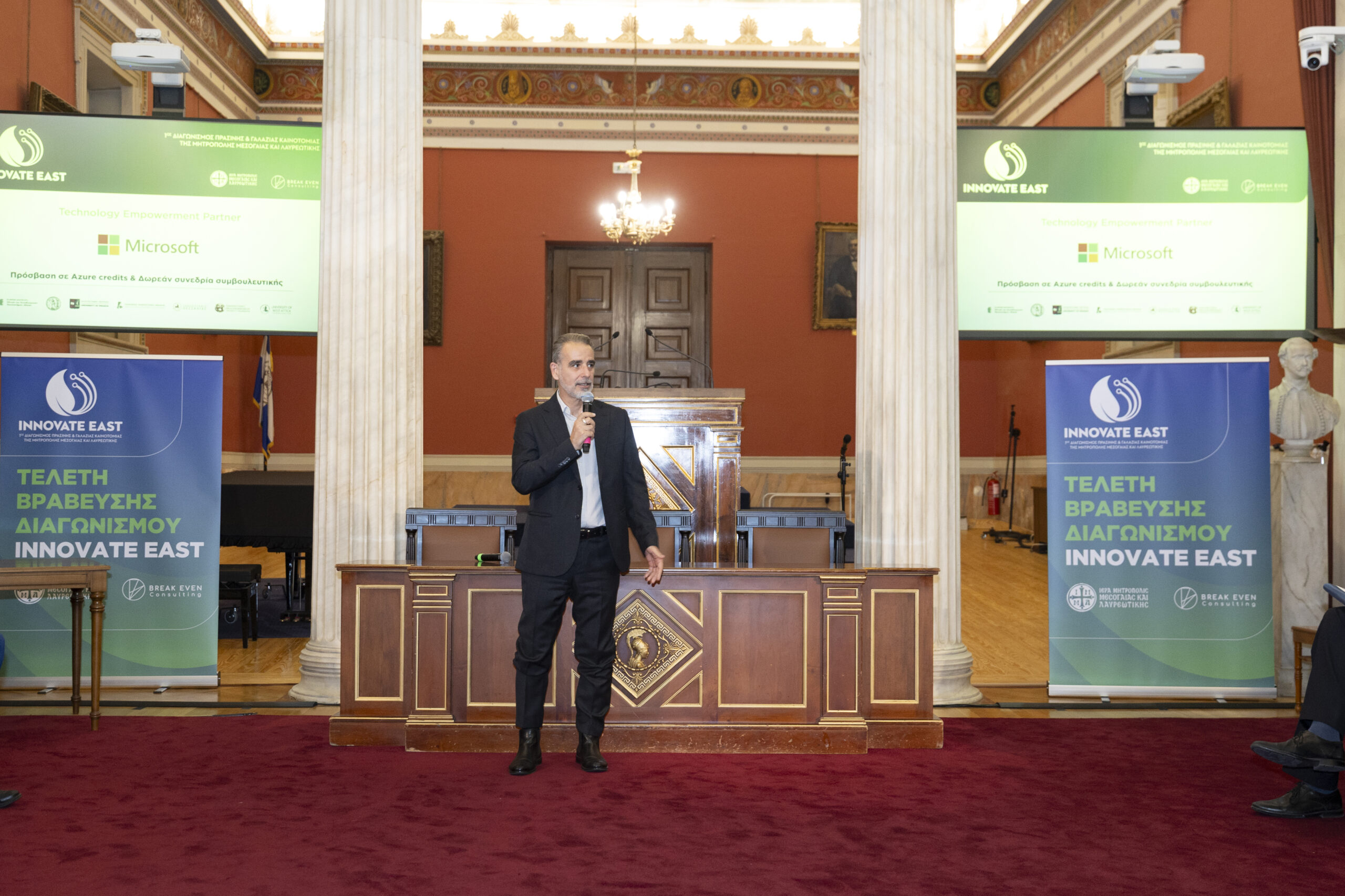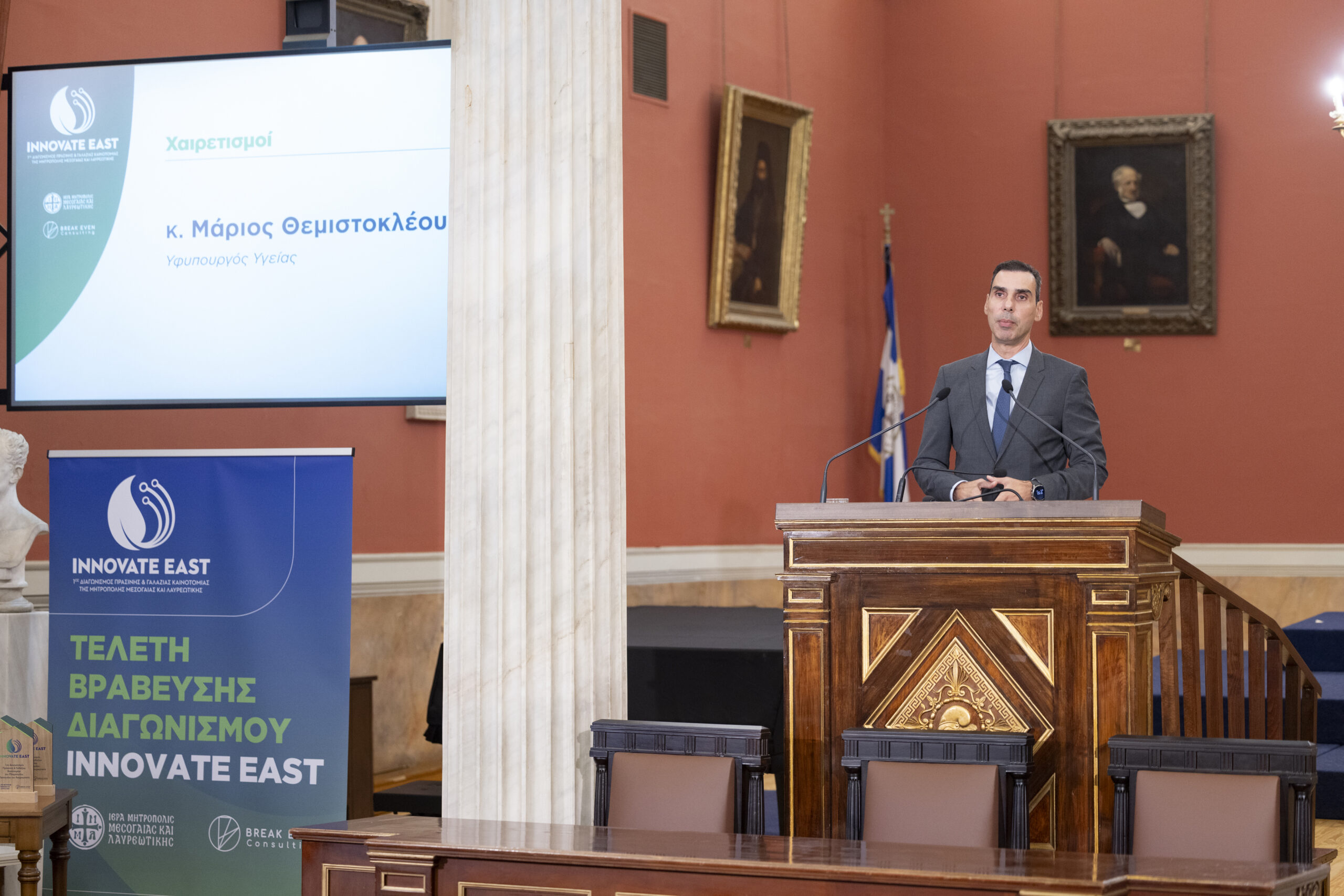 Στην εμβληματική Μεγάλη Αίθουσα Τελετών του Εθνικού και Καποδιστριακού Πανεπιστημίου Αθηνών, παρουσία Υπουργών, Πρυτανικών Αρχών κορυφαίων Πανεπιστημίων της χώρας, εκπροσώπων της Τοπικής Αυτοδιοίκησης, καθώς και επιφανών στελεχών της επιχειρηματικής κοινότητας, ολοκληρώθηκε με πολύ μεγάλη επιτυχία ο 1ος Διαγωνισμός Πράσινης και Γαλάζιας Καινοτομίας της Μητρόπολης Μεσογαίας και Λαυρεωτικής, Innovate East