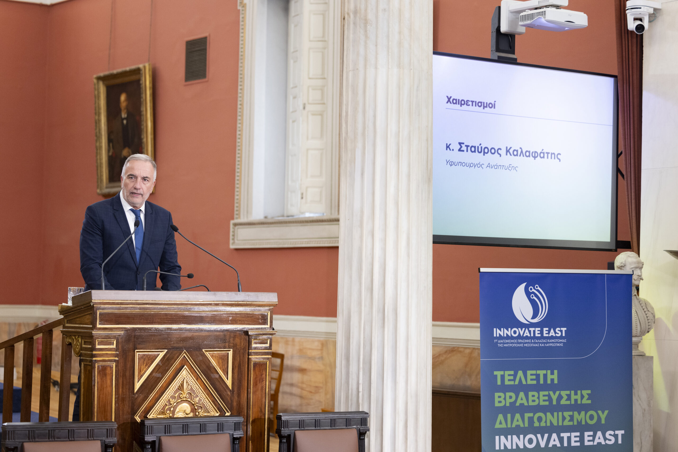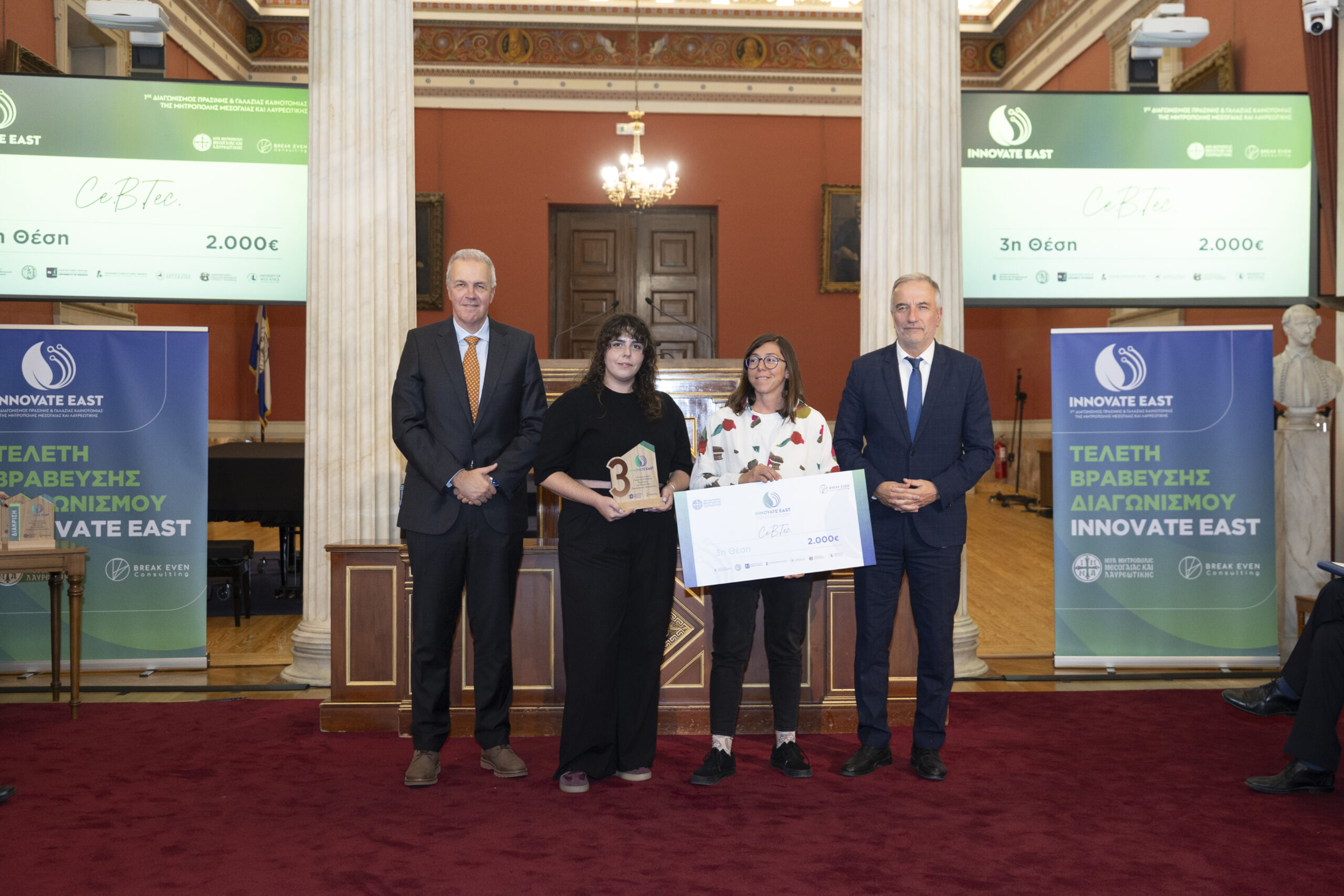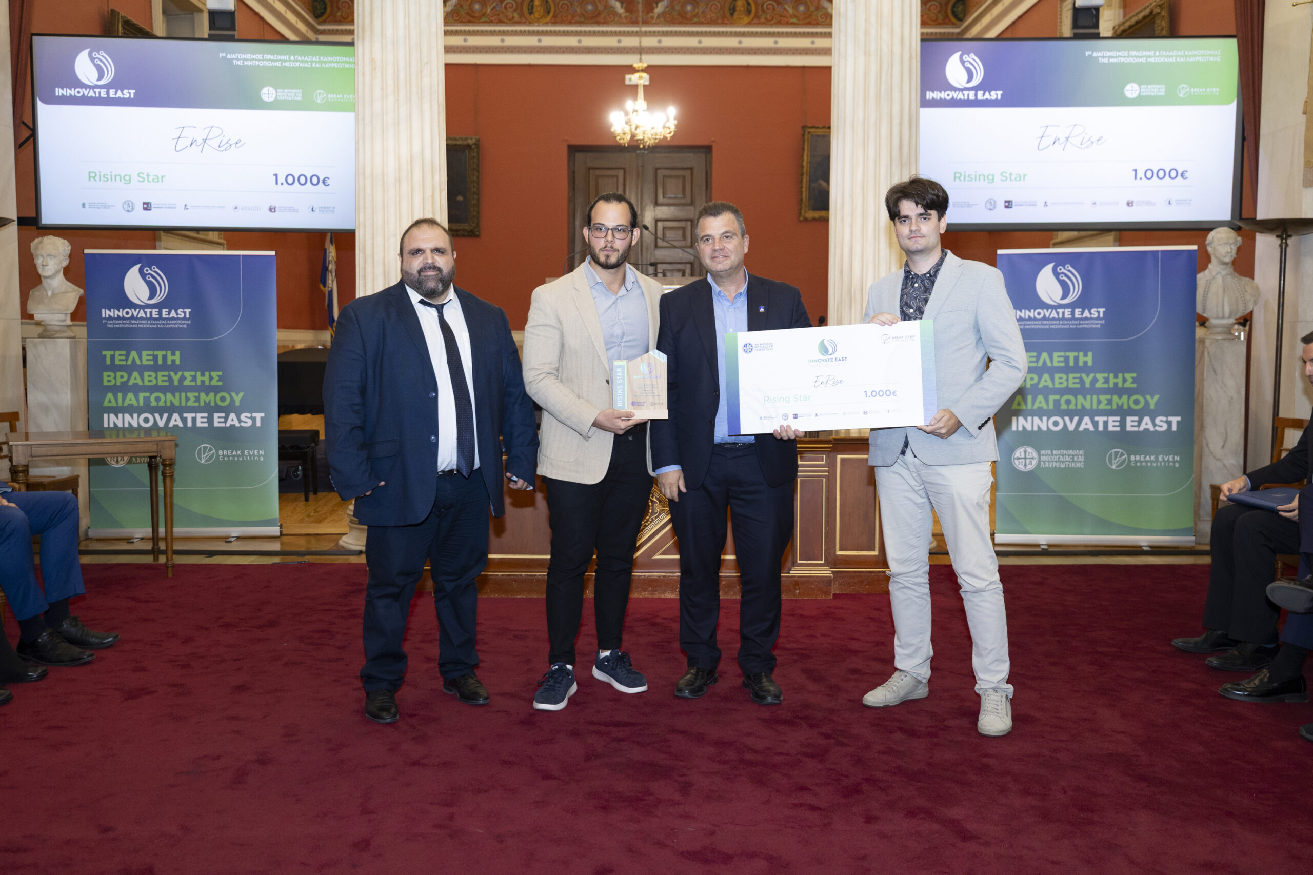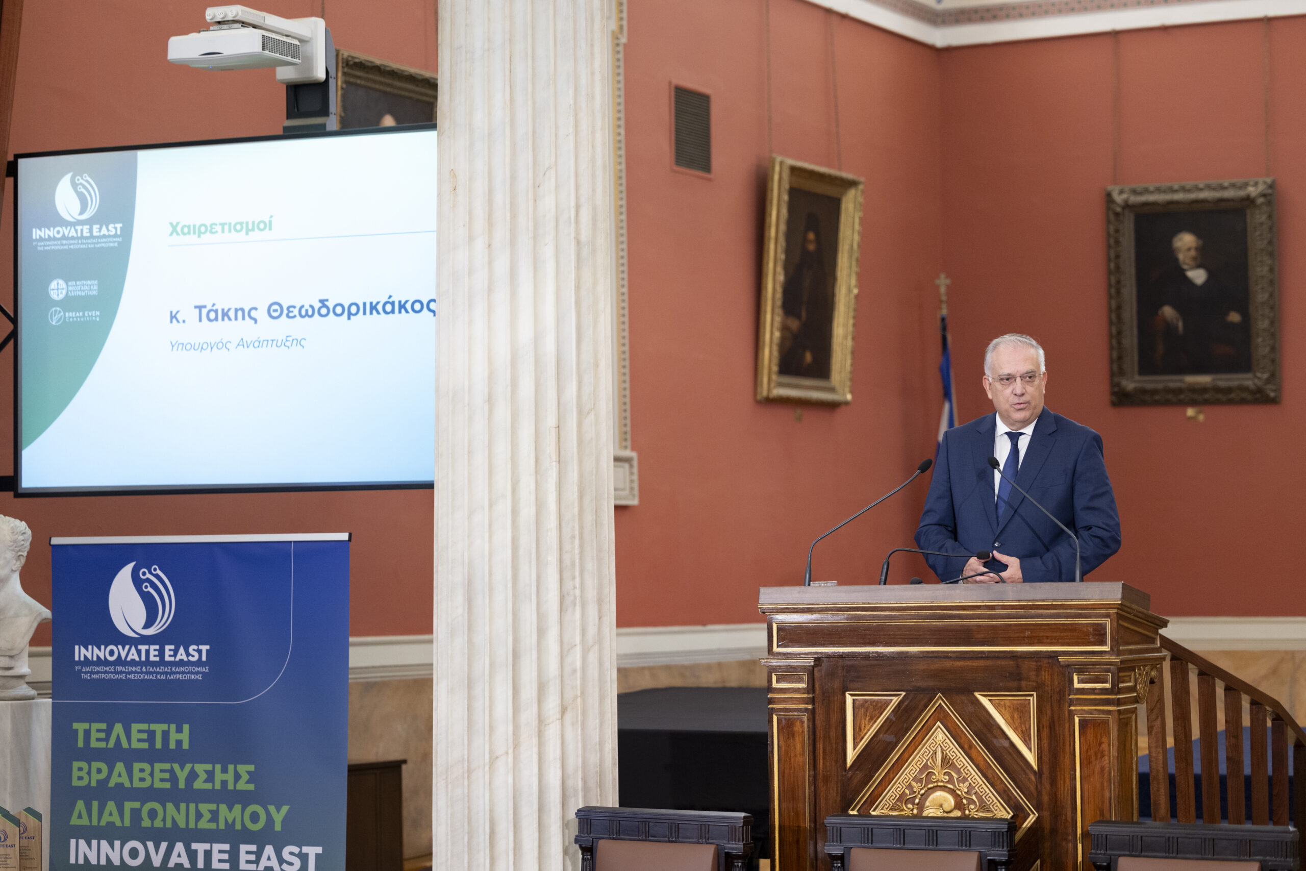 Στην εμβληματική Μεγάλη Αίθουσα Τελετών του Εθνικού και Καποδιστριακού Πανεπιστημίου Αθηνών, παρουσία Υπουργών, Πρυτανικών Αρχών κορυφαίων Πανεπιστημίων της χώρας, εκπροσώπων της Τοπικής Αυτοδιοίκησης, καθώς και επιφανών στελεχών της επιχειρηματικής κοινότητας, ολοκληρώθηκε με πολύ μεγάλη επιτυχία ο 1ος Διαγωνισμός Πράσινης και Γαλάζιας Καινοτομίας της Μητρόπολης Μεσογαίας και Λαυρεωτικής, Innovate East