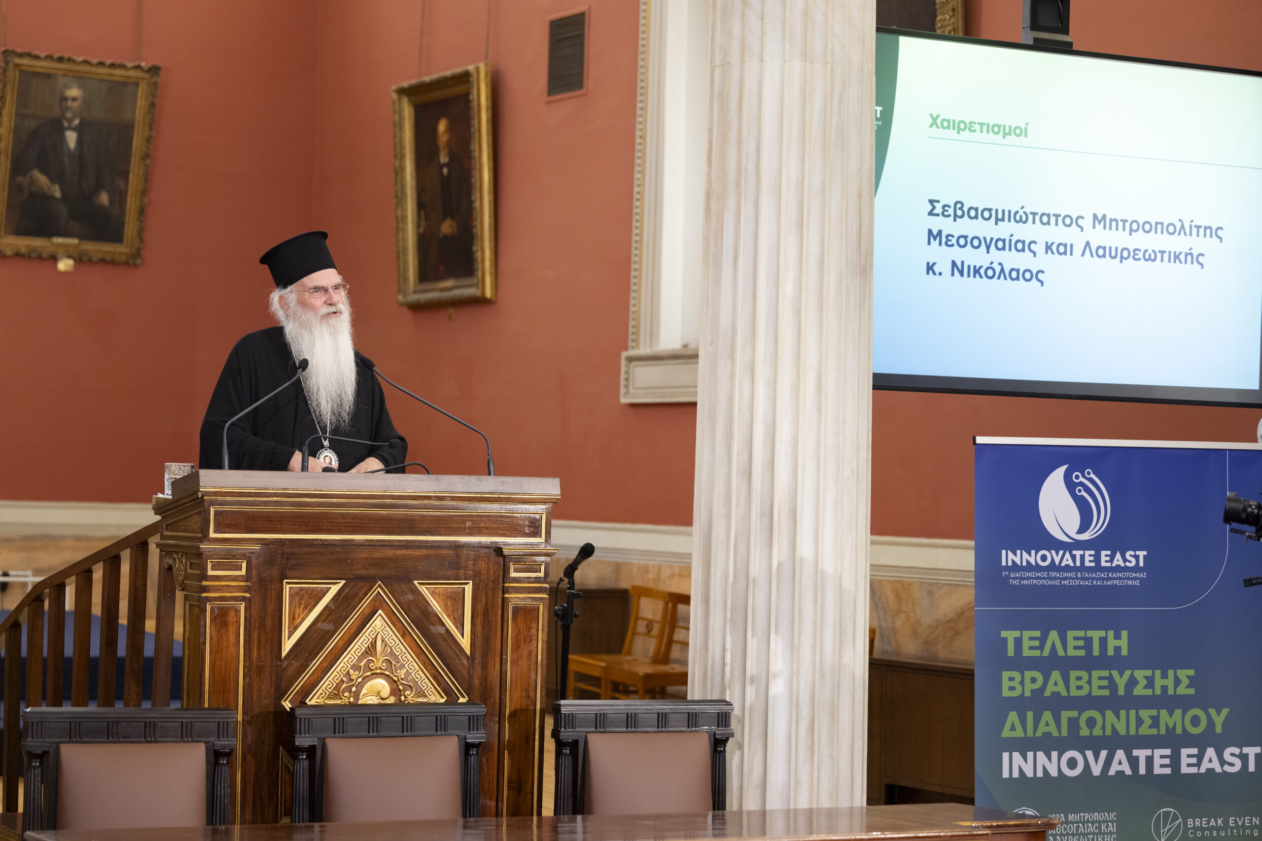 Ο Σεβ. Μητροπολίτης Μεσογαίας και Λαυρεωτικής, κ. Νικόλαος τόνισε ότι «μια Εκκλησία που δεν καινοτομεί, δεν είναι Εκκλησία – όπως κι ένας νέος που δεν καινοτομεί, δεν είναι νέος». Υπογράμμισε ότι η πρωτοβουλία του διαγωνισμού δεν αποσκοπούσε στην προβολή της Εκκλησίας, αλλά «απαντά σε μια πραγματική ανάγκη της Ανατολικής Αττικής, μιας περιοχής με γη, καρπούς, αμπέλια, ηλιοφάνεια και πράσινο, που απαιτούν οικολογική μέριμνα και φροντίδα». Παράλληλα, ανέδειξε τη δυναμική των αναπτυσσόμενων οικονομικών δραστηριοτήτων, όπως τα αεροδρόμια, τα λιμάνια, τα επιχειρηματικά πάρκα και τα data centers, τονίζοντας ότι «η βιώσιμη ανάπτυξη είναι το ζητούμενο, με γνώμονα τι θα παραδώσουμε στις επόμενες γενιές». Όπως ανέφερε χαρακτηριστικά, «η Εκκλησία δεν πρέπει να φοβάται την καινοτομία· οφείλει με τους πόρους της να διευκολύνει νέους δρόμους για τα Πανεπιστήμια, τους ερευνητές και τους νέους ανθρώπους που τολμούν».